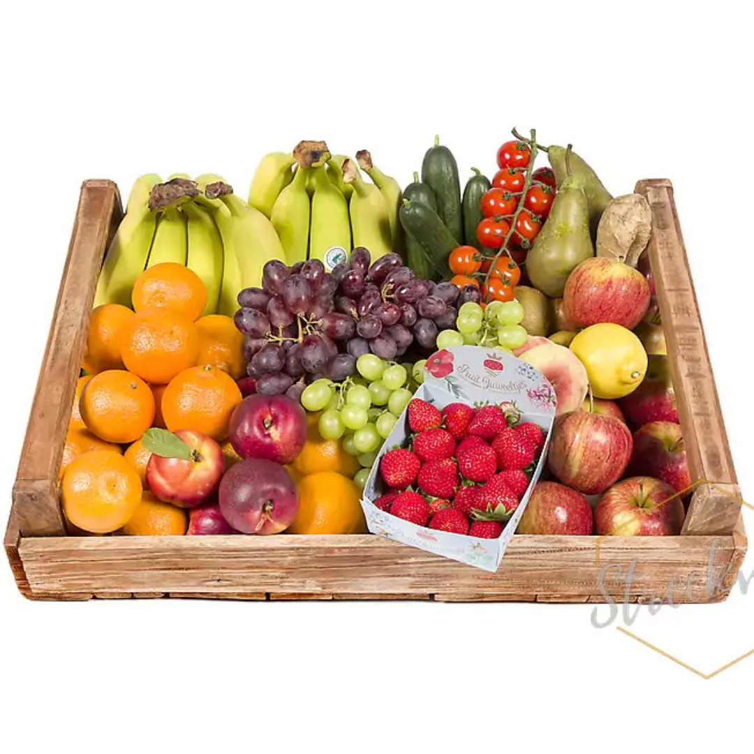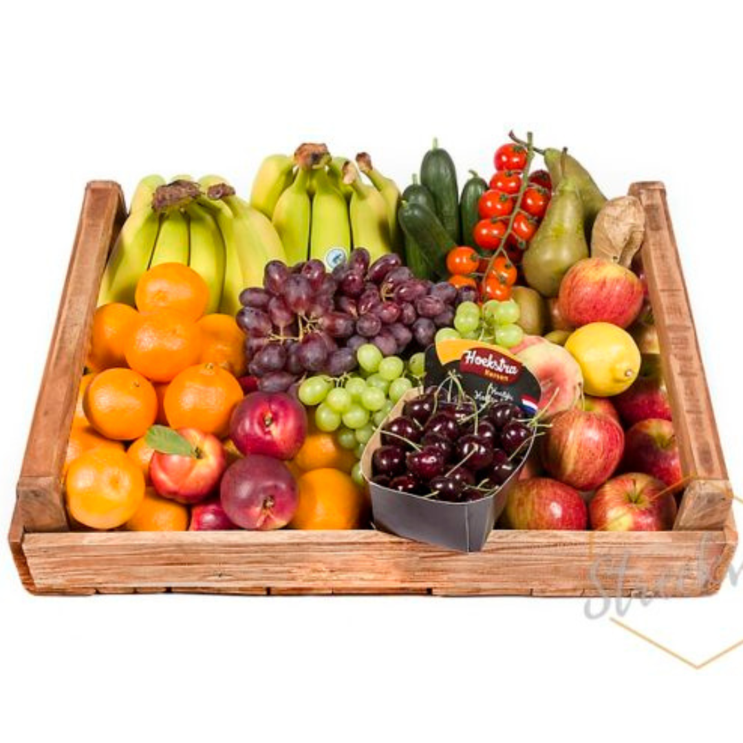De Deluxe Fruitbox 60Â ‘Compleet’ bevat topfruit met meerdere soorten appels, peren, mandarijnen, snackgroentes, sinaasappels seizoensfruit en Fairtrade bananen.